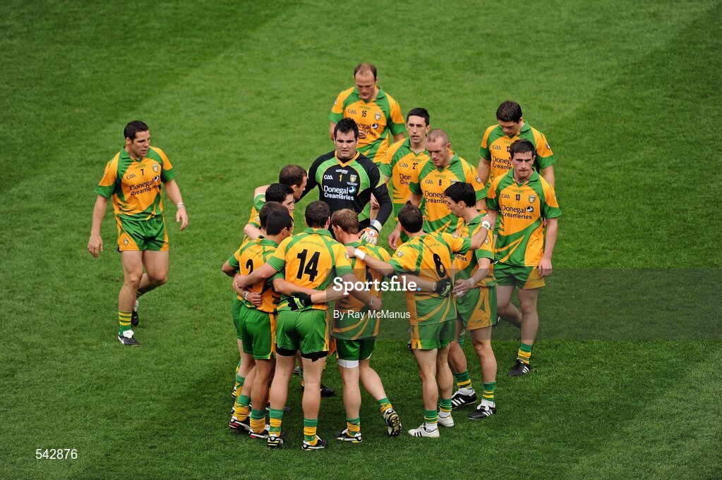 30 July 2011; The Donegal players gather in a huddle and listen to captain Michael Murphy before the game. Murphy did not start. GAA Football All-Ireland Senior Championship Quarter-Final, Donegal v Kildare, Croke Park, Dublin. Picture credit: Ray McManus / SPORTSFILE