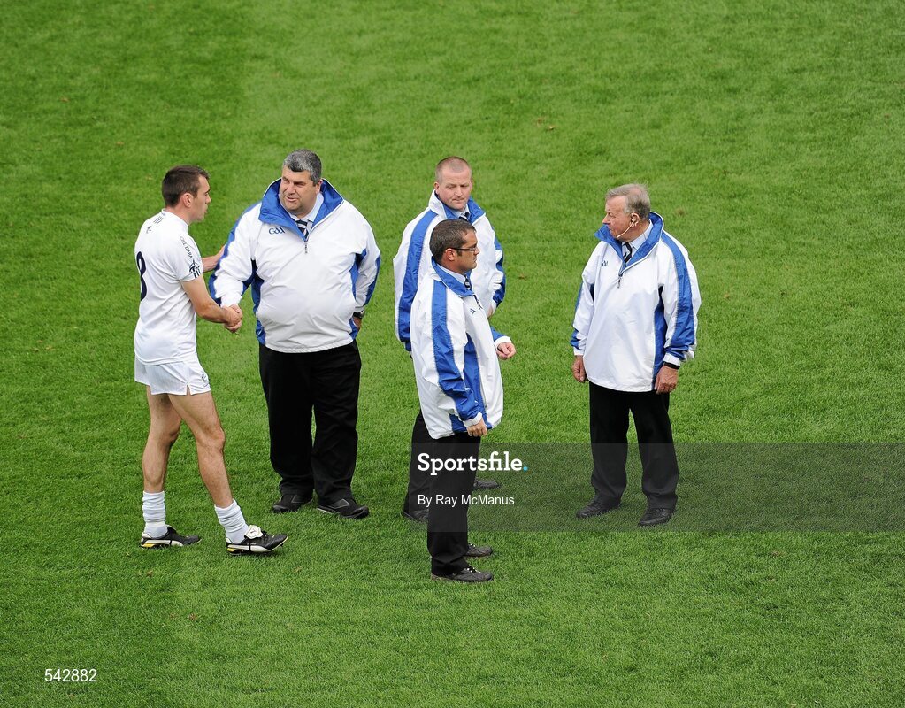 30 July 2011; Kildare captain John Doyle greets each of the games umpires before the 'toss'. GAA Football All-Ireland Senior Championship Quarter-Final, Donegal v Kildare, Croke Park, Dublin. Picture credit: Ray McManus / SPORTSFILE