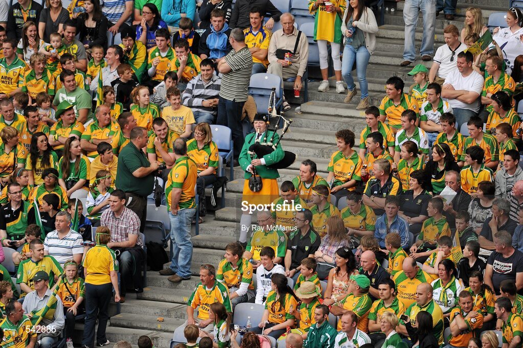30 July 2011; Donegal piper Christy Murray, from Raphoe, arrives to take his seat with a group of Donegal supporters. GAA Football All-Ireland Senior Championship Quarter-Final, Donegal v Kildare, Croke Park, Dublin. Picture credit: Ray McManus / SPORTSFILE