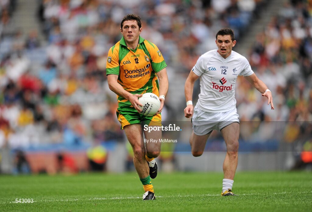 30 July 2011; Ryan Bradley, Donegal, in action against Eamonn Callaghan, Kildare. GAA Football All-Ireland Senior Championship Quarter-Final, Donegal v Kildare, Croke Park, Dublin. Picture credit: Ray McManus / SPORTSFILE