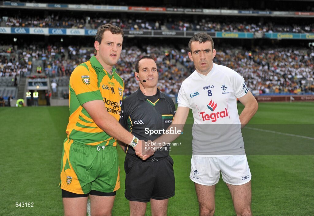 30 July 2011; Donegal captain Michael Murphy shakes hands with Kildare captain John Doyle under the eye of referee David Coldrick. GAA Football All-Ireland Senior Championship Quarter-Final, Donegal v Kildare, Croke Park, Dublin. Picture credit: Dáire Brennan / SPORTSFILE