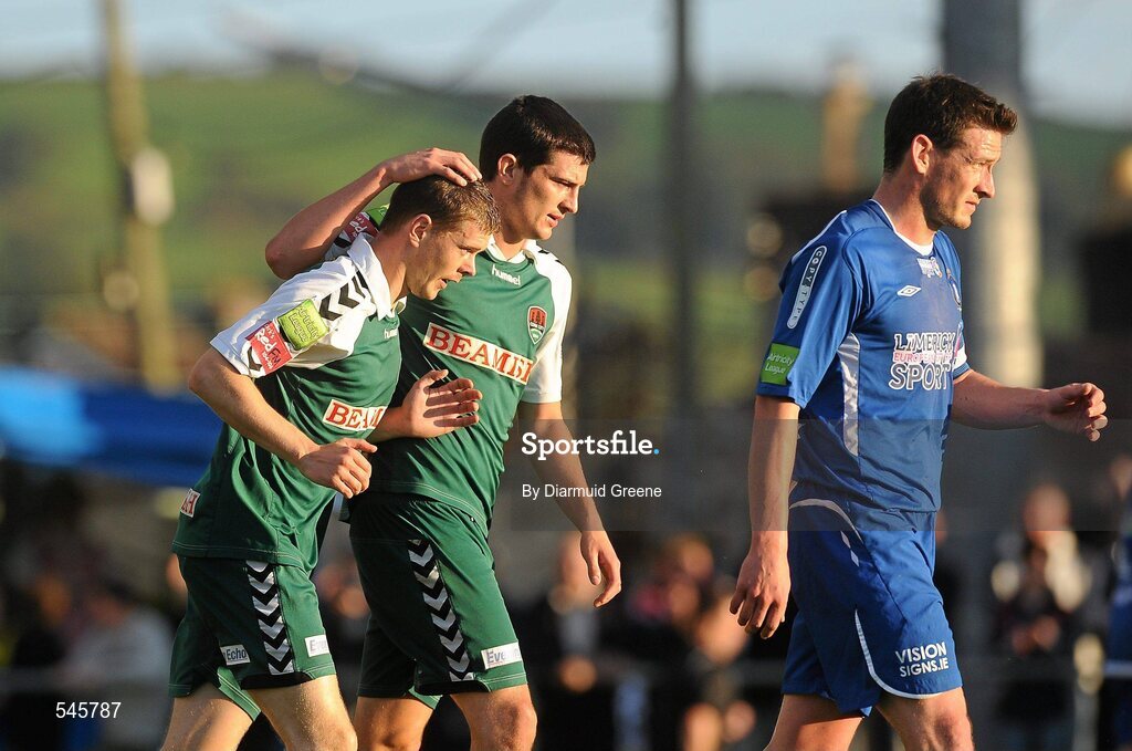8 August 2011; Davin O'Neill, Cork City, left, is congratulated by team-mate Shane Duggan, after scoring his side's first goal. EA Sports Cup Semi-Final, Cork City v Limerick FC, Turner’s Cross, Cork. Picture credit: Diarmuid Greene / SPORTSFILE