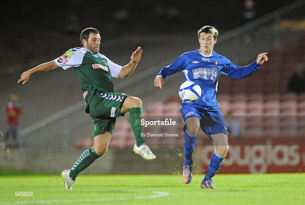8 August 2011; Paudie Quinn, Limerick FC, in action against Greg O'Halloran, Cork City. EA Sports Cup Semi-Final, Cork City v Limerick FC, Turner’s Cross, Cork. Picture credit: Diarmuid Greene / SPORTSFILE