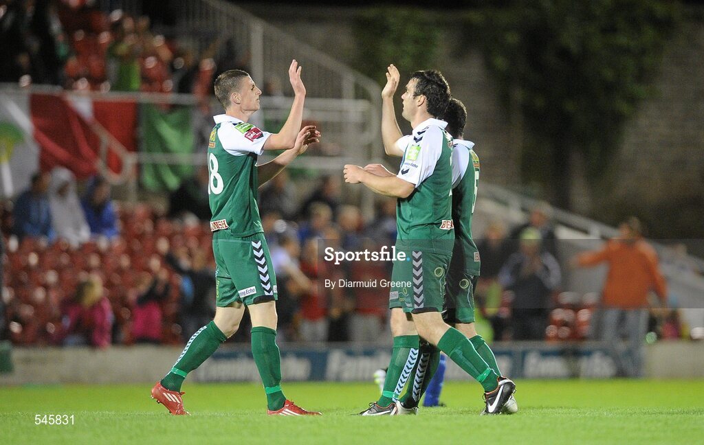 8 August 2011; Kalen Spillane, left, and Gavin Kavanagh, Cork City, celebrate after team-mate Graham Cummins scored their side's third goal during the second half of extra time. EA Sports Cup Semi-Final, Cork City v Limerick FC, Turner’s Cross, Cork. Picture credit: Diarmuid Greene / SPORTSFILE
