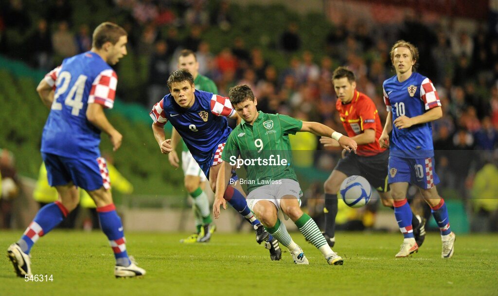 10 August 2011; Shane Long, Republic of Ireland, in action against Odnjen Vukojevic, 8, Sime Vrsaljko, 24, and Luka Modric, Croatia. International Soccer Friendly, Republic of Ireland v Croatia, Aviva Stadium, Lansdowne Road, Dublin. Picture credit: Brian Lawless / SPORTSFILE