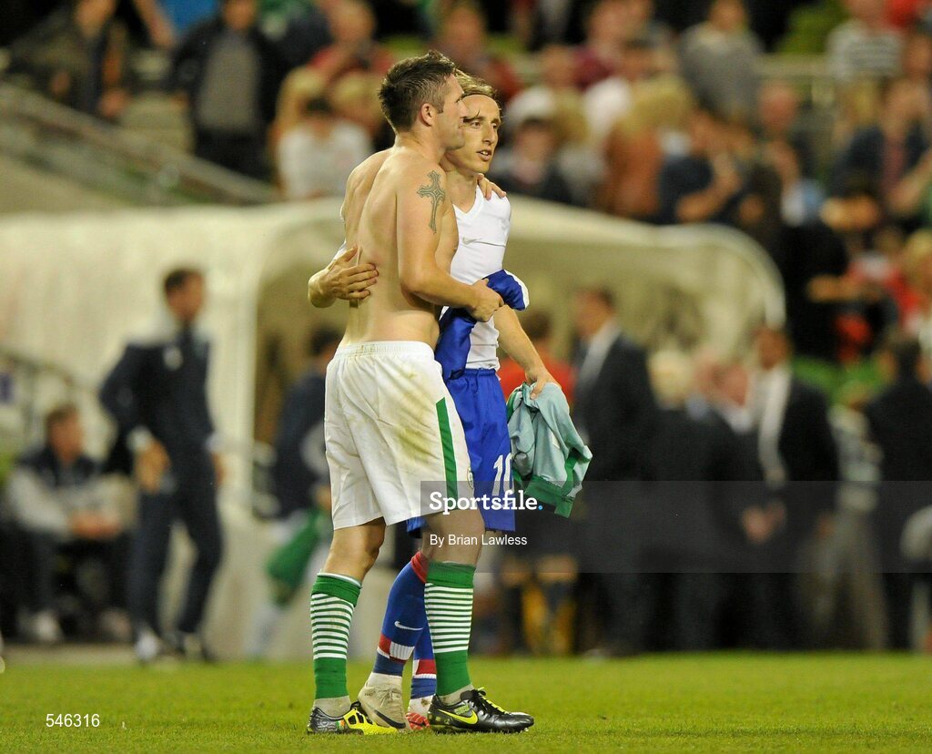 10 August 2011; Republic of Ireland's Robbie Keane exhanges jersey's with Croatia's Luka Modric. International Soccer Friendly, Republic of Ireland v Croatia, Aviva Stadium, Lansdowne Road, Dublin. Picture credit: Brian Lawless / SPORTSFILE