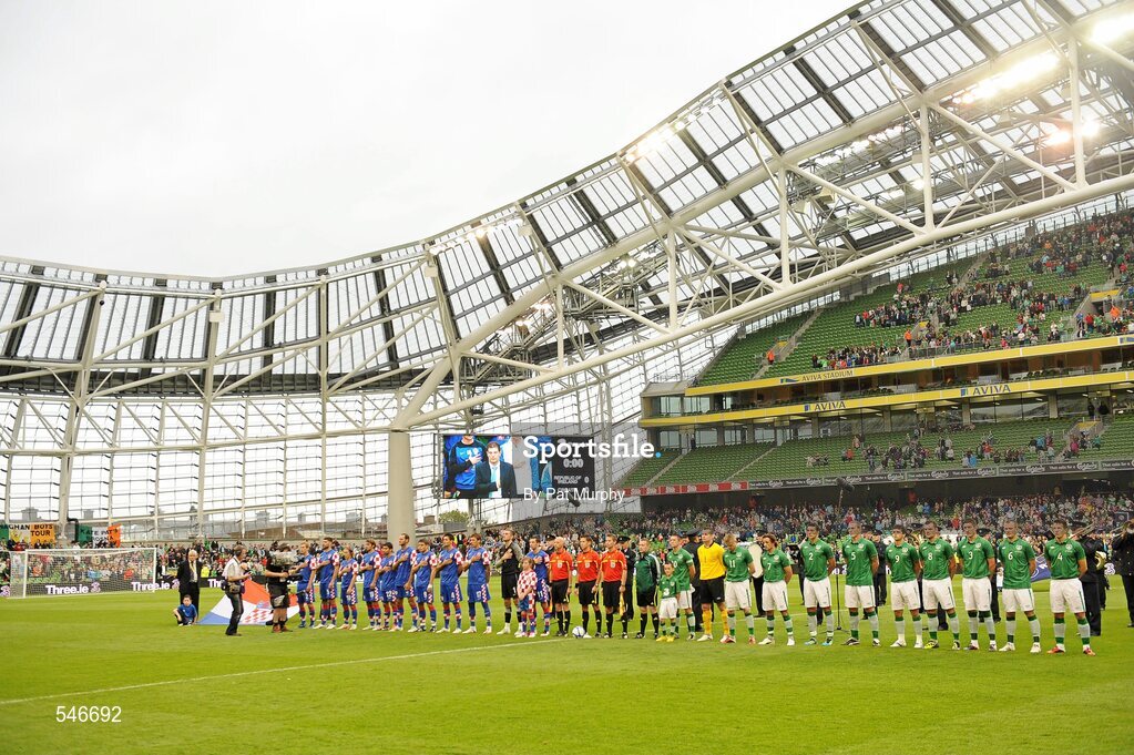 10 August 2011; The Republic of Ireland and Croatia teams line up for the National Anthems before the game. International Soccer Friendly, Republic of Ireland v Croatia, Aviva Stadium, Lansdowne Road, Dublin. Picture credit: Pat Murphy / SPORTSFILE