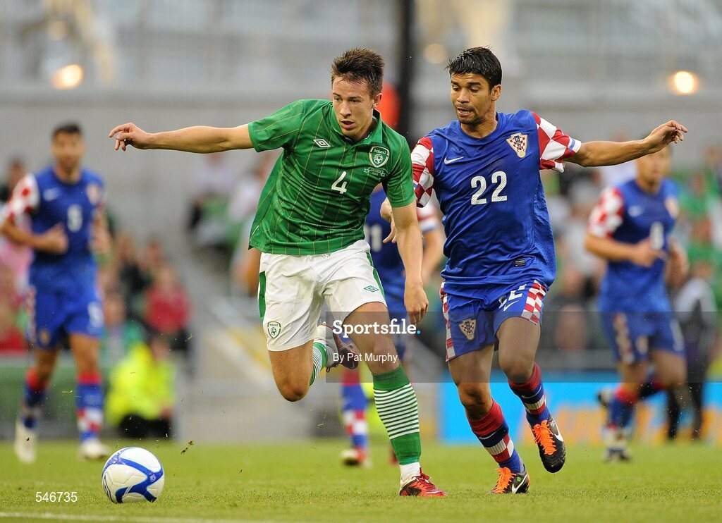 10 August 2011; Sean St. Ledger, Republic of Ireland, in action against Eduardo Da Silva, Croatia. International Soccer Friendly, Republic of Ireland v Croatia, Aviva Stadium, Lansdowne Road, Dublin. Picture credit: Pat Murphy / SPORTSFILE