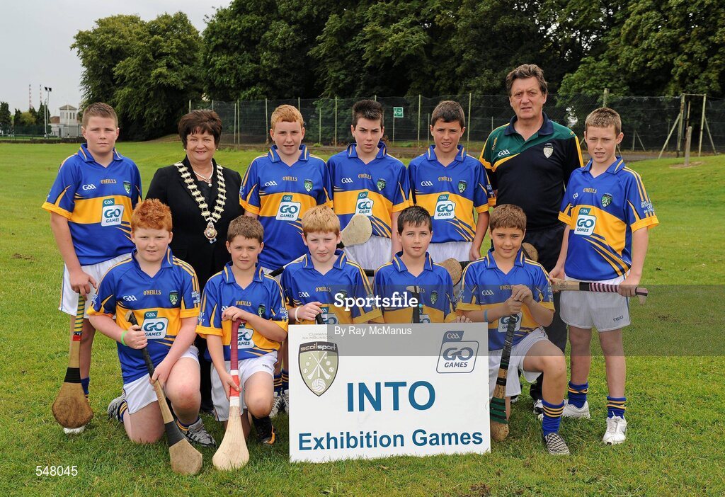 14 August 2011; Vice President of the I.N.T.O. Anne Fay with the Tipperary hurling team, back row, left to right, Jason Power, Glenville N.S., Glenville, Co. Cork, Cilian Byrne, St. Colmcille’s N.S. Knocklyon, Co. Dublin, Cathal Geary, Scoil Mhuire, Tallow, Co. Waterford, Michael Barlow, Ardfinnan N.S., Clonmel, Co. Tipperary, Eugene Fitzgibbon, coach, and Cormac Doyle, C.B.S., Doon, Co. Limerick, front row, left to right, Alan Duggan, Briehill N.S., Co. Galway, Ian Condon, St. Stepehn’s N.S., Co. Waterford, Diarmuid Carney, St. Michael’s N.S., Cootehill, Co. Cavan, Cormac Timoney, St. Felim’s N.S., Ballinagh, Co. Cavan, and Nicholas Mac an Rí, Scoil Mobhi, Glasnaoin, Co. Dublin. Go Games Exhibition - Sunday 14th August 2011, Clonliffe College, Dublin. Picture credit: Ray McManus / SPORTSFILE