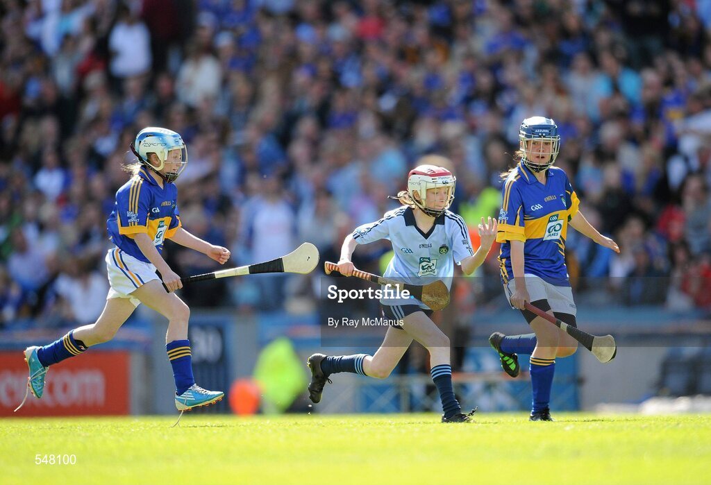 14 August 2011; Dublin's Myra O’Sullivan, Scoil an Athat Tadgh, Carrignavar, Co. Cork, in action against Ann Marie Smyth, St. Patrick’s P.S., Ballygalget, Co. Down, left, and Amy McGonigle, St. Mura’s N.S., Tooban, Co. Donegal, Tipperary. Go Games Exhibition - Sunday 14th August 2011, Croke Park, Dublin. Picture credit: Ray McManus / SPORTSFILE