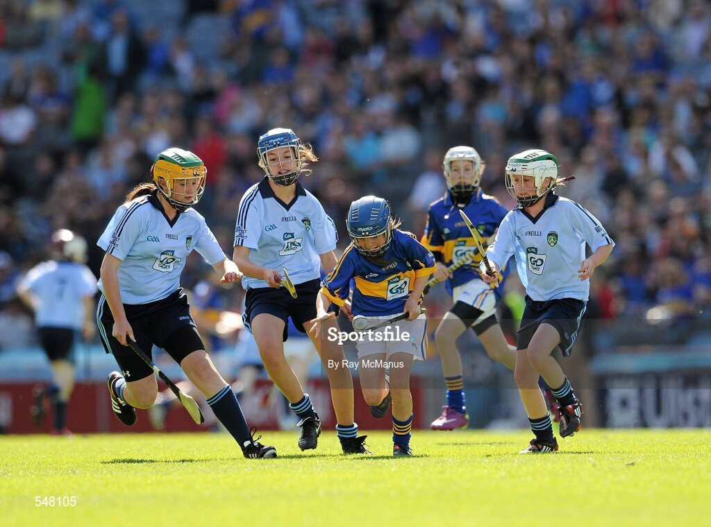14 August 2011; Tipperary's Norette Casey, Ardfert N.S., Ardfert, Co. Kerry, in action against Dublin players, from left, Aoife Coughlin, Crecora N.S., Patrickswell, Co. Limerick, Sorcha McDonald, Clontibret N.S., Co. Monaghan, and Tierna Johnston, Holy Child P.S., Belfast, Co. Antrim. Go Games Exhibition - Sunday 14th August 2011, Croke Park, Dublin. Picture credit: Ray McManus / SPORTSFILE