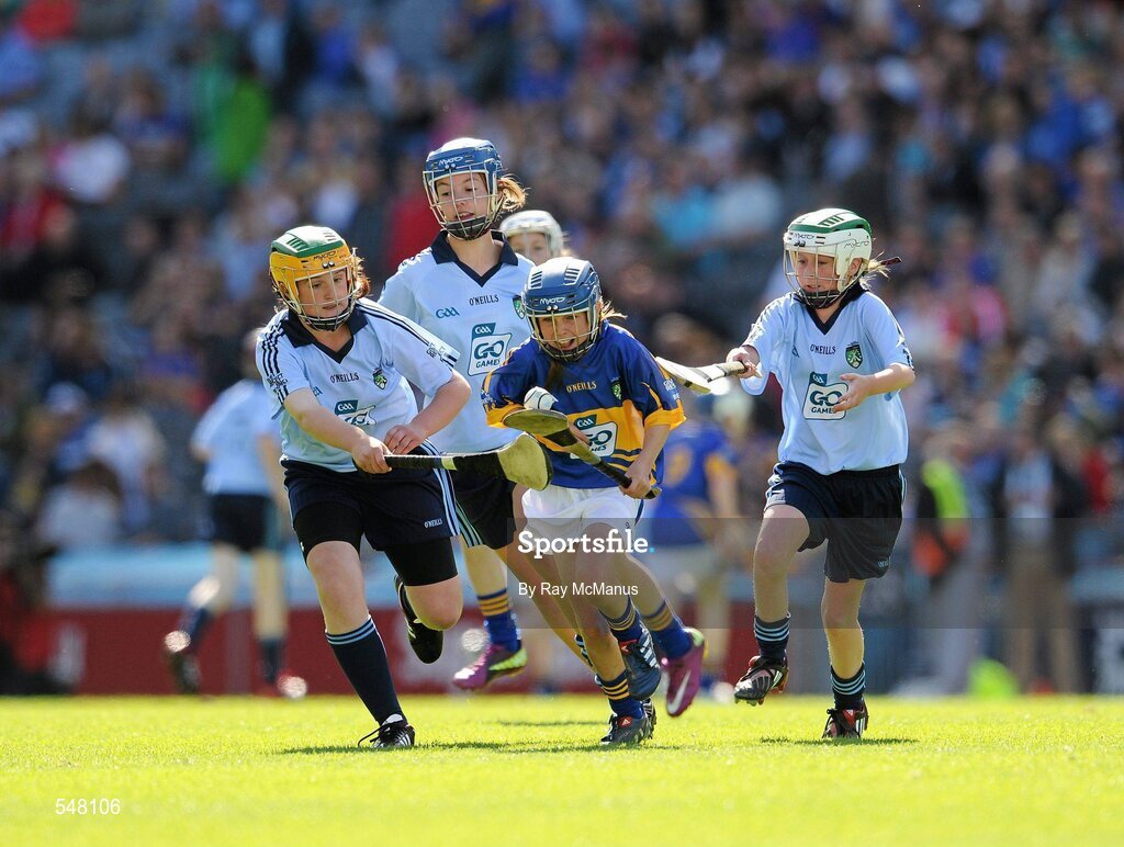 14 August 2011; Tipperary's Norette Casey, Ardfert N.S., Ardfert, Co. Kerry, in action against Dublin players, from left, Aoife Coughlin, Crecora N.S., Patrickswell, Co. Limerick, Sorcha McDonald, Clontibret N.S., Co. Monaghan, and Tierna Johnston, Holy Child P.S., Belfast, Co. Antrim. Go Games Exhibition - Sunday 14th August 2011, Croke Park, Dublin. Picture credit: Ray McManus / SPORTSFILE