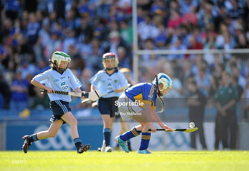 14 August 2011; Ann Marie Smyth, St. Patrick’s P.S., Ballygalget, Co. Down, Tipperary, in action against Tierna Johnston, Holy Child P.S., Belfast, Co. Antrim, Dublin. Go Games Exhibition - Sunday 14th August 2011, Croke Park, Dublin. Picture credit: Ray McManus / SPORTSFILE