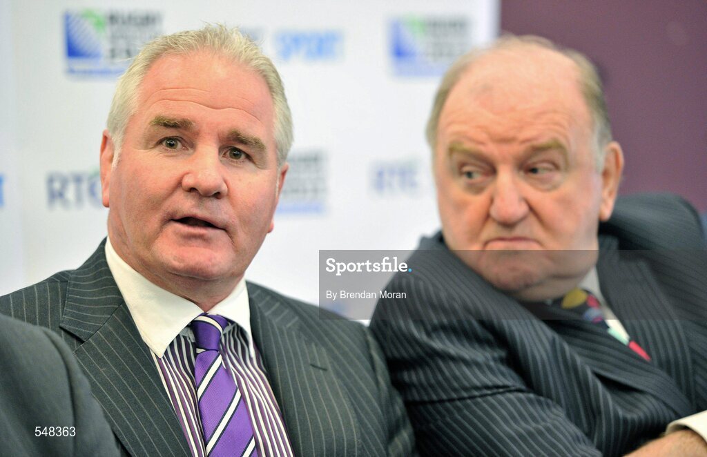 17 August 2011; Rugby analysts Brent Pope, left, and George Hook in attendance at the launch of RTÉ Sport's Rugby World Cup 2011 coverage, sponsored by O2, which includes all of Ireland's games broadcast live as part of 130 hours of coverage across television, radio and online. RTÉ, Donnybrook, Dublin. Picture credit: Brendan Moran / SPORTSFILE