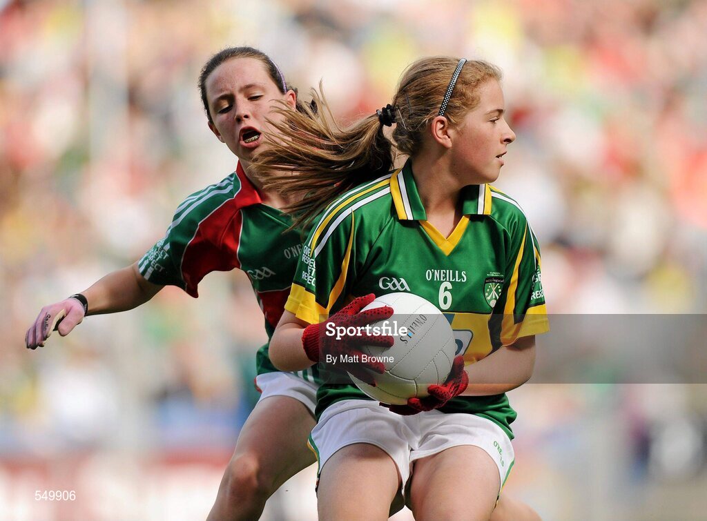21 August 2011; Aimee Oates, Kerry, in action against Eileen Flannery, Mayo. Go Games Exhibition - Sunday 21st August 2011, Croke Park, Dublin. Picture credit: Matt Browne / SPORTSFILE