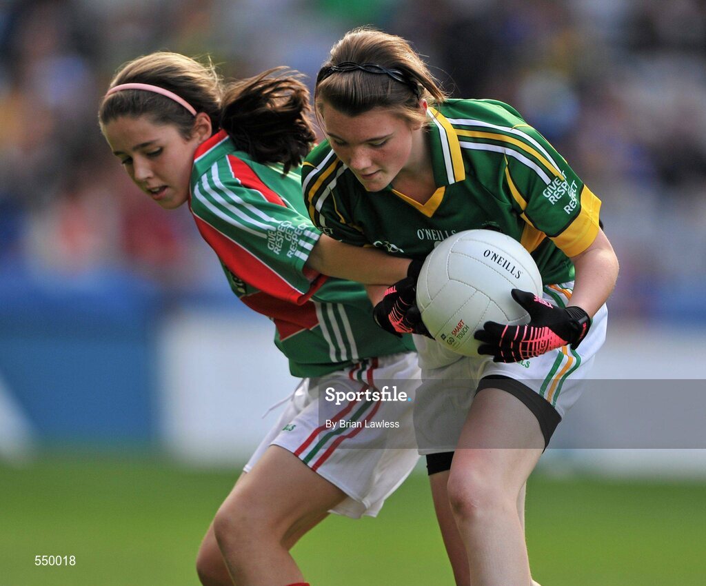 21 August 2011; Kate Hendrick, St. Brigid's N.S. Clonegal, Wexford, in action against Emma Gildea, St. Mary's NS Dungarvan, Waterford. Go Games Exhibition - Sunday 21st August 2011, Croke Park, Dublin. Picture credit: Brian Lawless / SPORTSFILE
