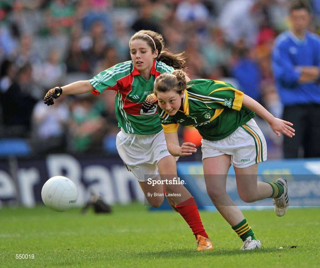 21 August 2011; Fiona Tully, Roxboro NS, Derrane, Roscommon, right, in action against Emma Gildea, St. Mary's NS, Dungarvan, Waterford, left. Go Games Exhibition - Sunday 21st August 2011, Croke Park, Dublin. Picture credit: Brian Lawless / SPORTSFILE