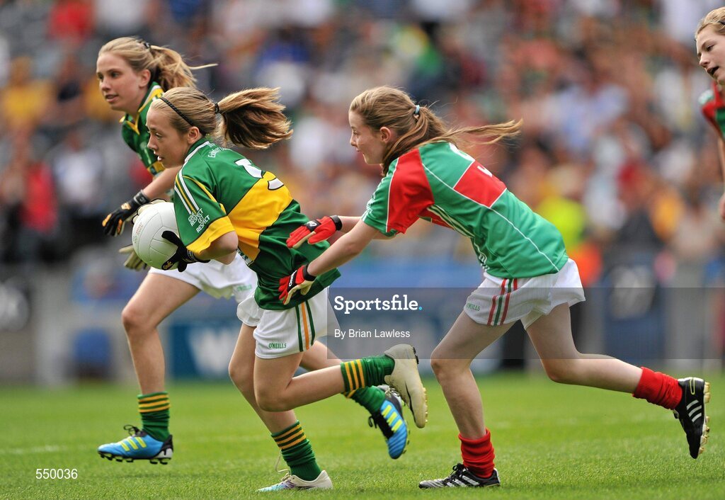 21 August 2011; Kate Hannon, An Chrois Naofa N.S., Glourthane, Co. Cork, in action against Katie Todd, St. Oliver Plunkett's N.S., Blackrock, Co. Louth. Go Games Exhibition - Sunday 21st August 2011, Croke Park, Dublin. Picture credit: Brian Lawless / SPORTSFILE
