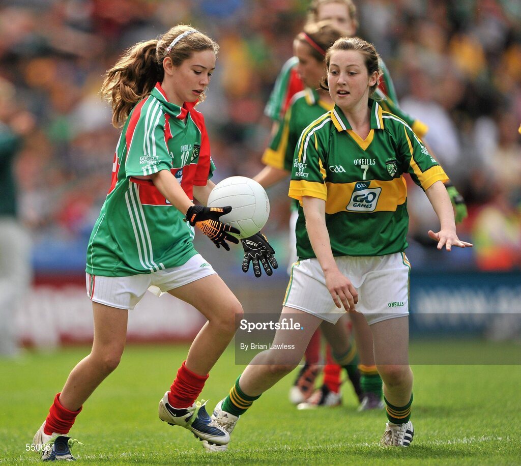 21 August 2011; Amy Nash, Scoil Eimhin Naofa, Monasterevin, Kildare, left, in action against Fiona Tully, Roxboro NS, Derrane, Roscommon. Go Games Exhibition - Sunday 21st August 2011, Croke Park, Dublin. Picture credit: Brian Lawless / SPORTSFILE