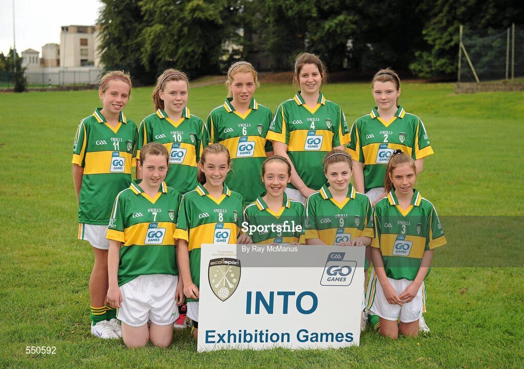 21 August 2011; The Kerry girls football team, back row, left to right, Niamh Purcell, Holy Cross N.S., Ballycarnane, Tramore, Co. Waterford, Sinéad Mohan, St. Patrick's N.S., Geevagh, Co. Sligo, Aimee Oates, Cliffoney N.S., Co. Sligo, Sinéad Walsh, Piltown N.S., Piltown, Co. Kilkenny, Kate Hendrick, St. Brigid's N.S., Clonegal, Co. Wexford, front row, left to right, Fiona Tully, Roxboro N.S., Derrane, Co. Roscommon, Beth Molloy, St. Colmcille's N.S., Knocklyon, Co. Dublin, Kate Hannon, An Chroí Naofa N.S., Glourthane, Co. Cork, Kate Ann Bergin, St. Joseph's N.S., Templemore, Co. Tipperary, Siobhra Ní Fhlaithbheartaigh, Gaelscoil Eoghain Uí Thuairisc, Co. Carlow. Go Games Exhibition - Sunday 21st August 2011, Clonliffe College, Dublin. Picture credit: Ray McManus / SPORTSFILE