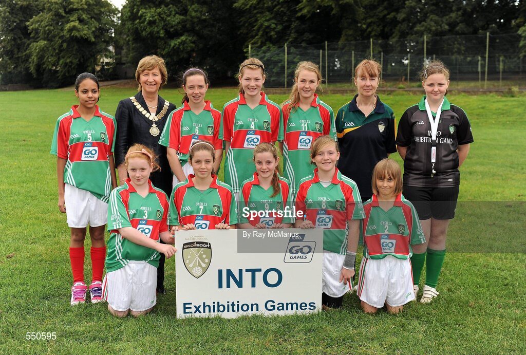 21 August 2011; INTO President Noreen Flynn with the Mayo girls football team, back row, left to right, Ketlyn Fonseca, Presentation N.S., Fermoy, Co. Cork, Eileen Flannery, St. Michael's N.S., Clonmel, Co. Tipperary, Emma Quinn, St. Manachan's N.S., Mohill, Co. Leitrim, Catríona Kirwan, Scoil Naomh Pádraig, Ballyroan, Co. Dublin, and referee Katie Dwyer, Craggagh N.S., Kiltimagh, Co. Mayo, front row, left to right, Dearbhla Mulholland, St. Mary's N.S., Glenview, Maghera, Co. Derry, Emma Gildea, St. Mary's N.S., Dungarvan, Co. Waterford, Katie Todd, St. Oliver Plunkett's N.S., Blackrock, Co. Louth, Amy Burke, Scoil Chaoimhín Naofa, Hollywood, Co. Wicklow, Mary Anne Murphy, St. Georges' RC School, Harrow, England. Go Games Exhibition - Sunday 21st August 2011, Clonliffe College, Dublin. Picture credit: Ray McManus / SPORTSFILE