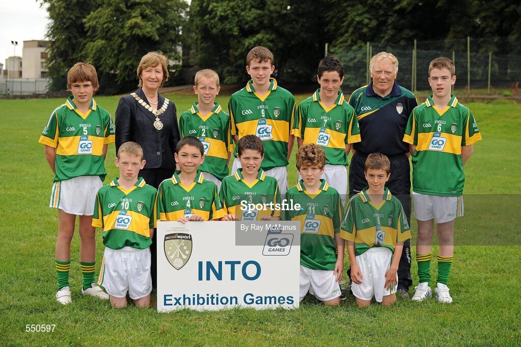 21 August 2011; INTO President Noreen Flynn with the Kerry boys team, back row, left to right, Keelan Butler, Knochanean N.S., Ennis, Co. Clare, Eoghan McElligott, Ardfert N.S., Co. Kerry, Jason Walsh, Corrandulla N.S., Corrandulla, Co. Galway, Adam Garland, St. Mary's P.S., Aughlisnafin, Co. Down, Shaun Highton, Christ the King B.N.S., Caherdavin, Co. Limerick, front row, left to right, David Greaney, Corrandulla N.S., Corrandulla, Co. Galway, Christopher Kong, St. Declan's N.S., Co. Waterford, Jamie McCann, Creggan P.S., Co. Antrim, Diarmuid O'Malley, St. Patrick's N.S., Castlebar, Co. Mayo, Tim Prenter, St. Patrick's P.S., Legamaddy, Co. Down. Go Games Exhibition - Sunday 21st August 2011, Clonliffe College, Dublin. Picture credit: Ray McManus / SPORTSFILE