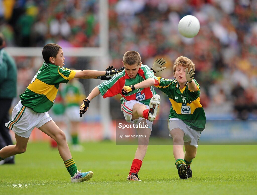 21 August 2011; Brandon Murphy, Shanagolden N.S., Shanagolden, Co. Limerick, playing for Mayo, in action against Christopher Kong, St. Declan's N.S., Co. Waterford, left, and Diarmuid O'Malley, St. Patrick's N.S., Castlebar, Co. Mayo, playing for Kerry. Go Games Exhibition - Sunday 21st August 2011, Croke Park, Dublin. Picture credit: Ray McManus / SPORTSFILE