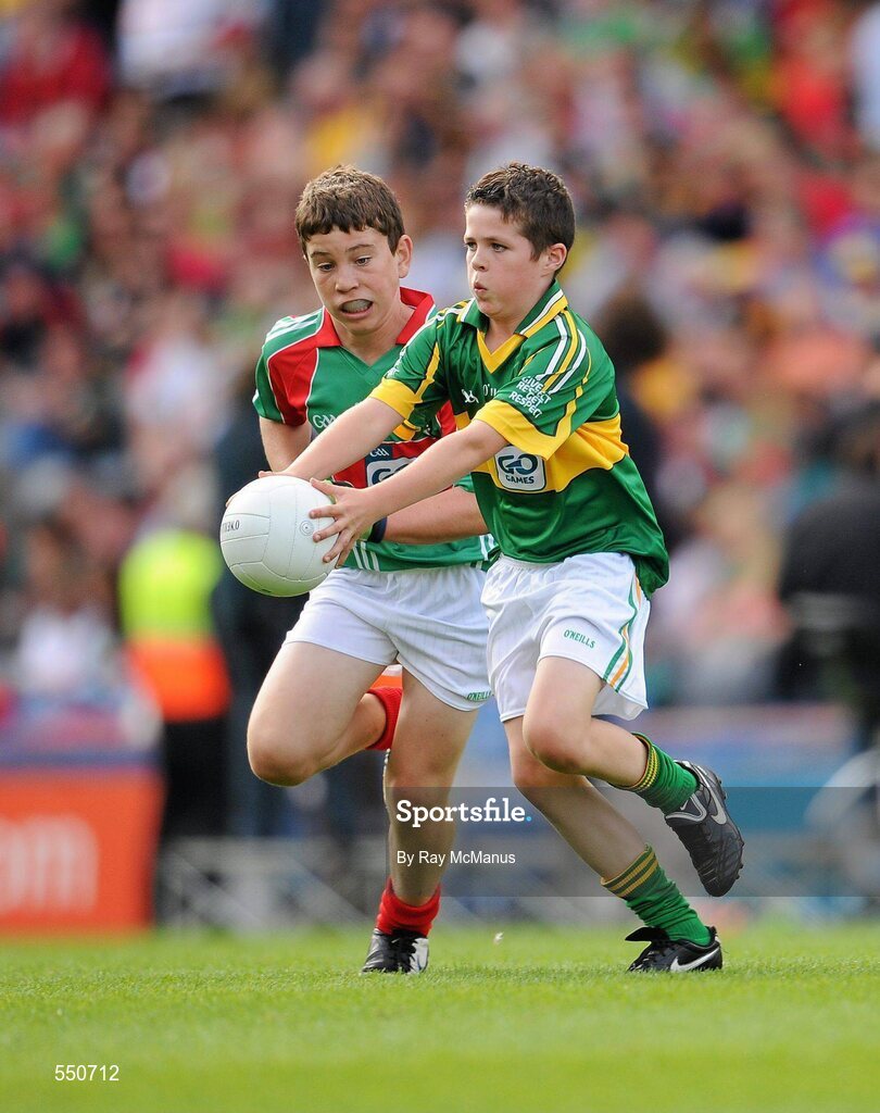 21 August 2011; Jamie McCann, Creggan P.S., Co. Antrim, representing Kerry, in action against Patrick Smyth, Scoil Eoin Baiste, Clontarf, Co. Dublin, representing Mayo. Go Games Exhibition - Sunday 21st August 2011, Croke Park, Dublin. Picture credit: Ray McManus / SPORTSFILE