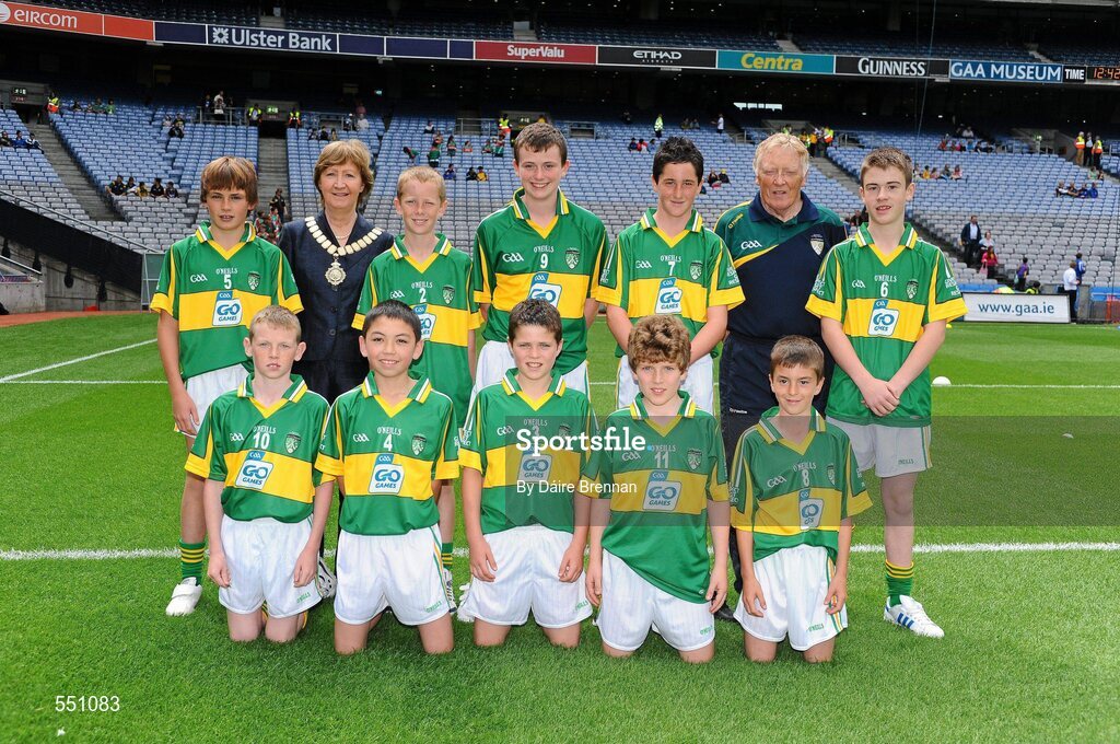 21 August 2011; INTO President Noreen Flynn with the Kerry boys team, back row, left to right, Keelan Butler, Knochanean N.S., Ennis, Co. Clare, Eoghan McElligott, Ardfert N.S., Co. Kerry, Jason Walsh, Corrandulla N.S., Corrandulla, Co. Galway, Adam Garland, St. Mary's P.S., Aughlisnafin, Co. Down, Shaun Highton, Christ the King B.N.S., Caherdavin, Co. Limerick, front row, left to right, David Greaney, Corrandulla N.S., Corrandulla, Co. Galway, Christopher Kong, St. Declan's N.S., Co. Waterford, Jamie McCann, Creggan P.S., Co. Antrim, Diarmuid O'Malley, St. Patrick's N.S., Castlebar, Co. Mayo, Tim Prenter, St. Patrick's P.S., Legamaddy, Co. Down. Go Games Exhibition - Sunday 21st August 2011, Croke Park, Dublin. Picture credit: Dáire Brennan / SPORTSFILE