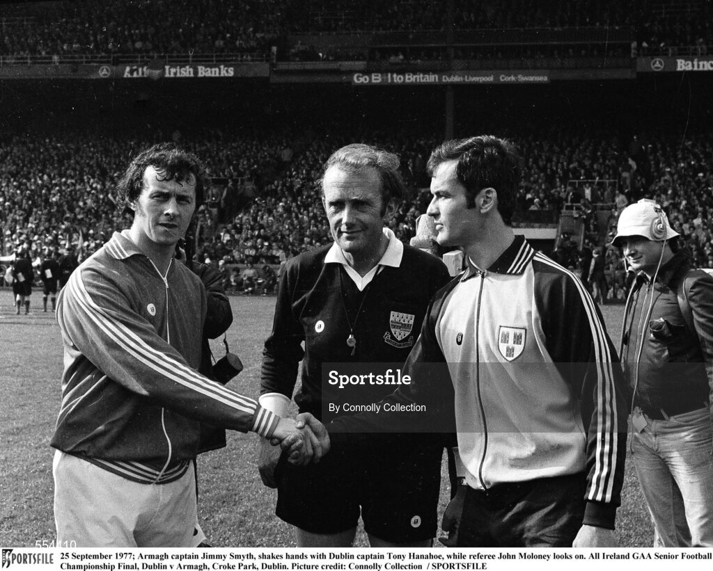 25 September 1977; Armagh captain Jimmy Smyth shakes hands with Dublin captain Tony Hanahoe, while referee John Moloney looks on. All-Ireland GAA Senior Football Championship Final, Dublin v Armagh, Croke Park, Dublin. Picture credit: Connolly Collection/SPORTSFILE