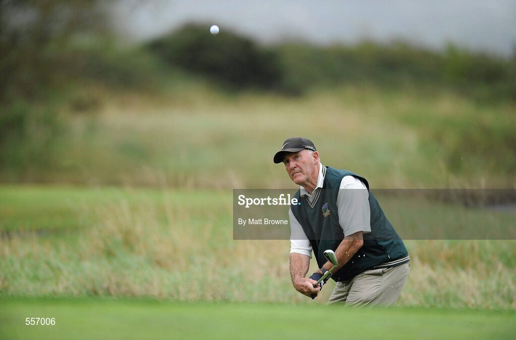 9 September 2011; Former Kilkenny hurler Eddie Keher, from Rower Inistioge GAA Club, Co. Kilkenny, pitches onto the 8th green during the 12th Annual All-Ireland GAA Golf Challenge 2011 Finals. Waterford Castle Golf and Country Club, Co. Waterford. Picture credit: Matt Browne / SPORTSFILE