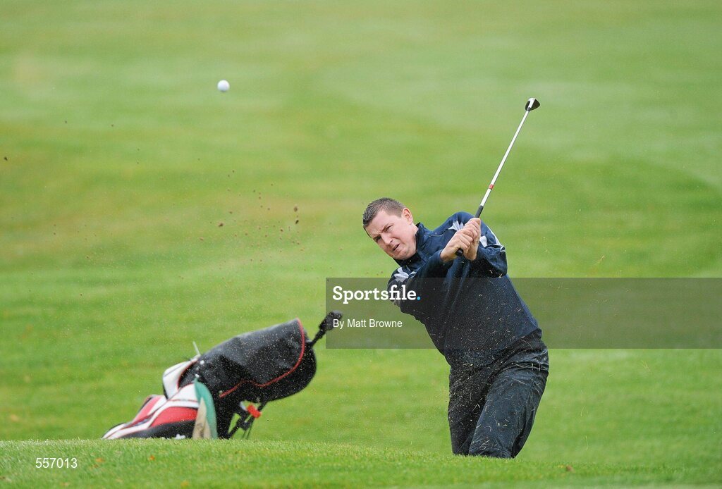 9 September 2011; Tipperary hurler Darren Gleeson, from Portroe GAA Club, Co. Tipperary, plays from a bunker onto the 14th green during the 12th Annual All-Ireland GAA Golf Challenge 2011 Finals. Waterford Castle Golf and Country Club, Co. Waterford. Picture credit: Matt Browne / SPORTSFILE