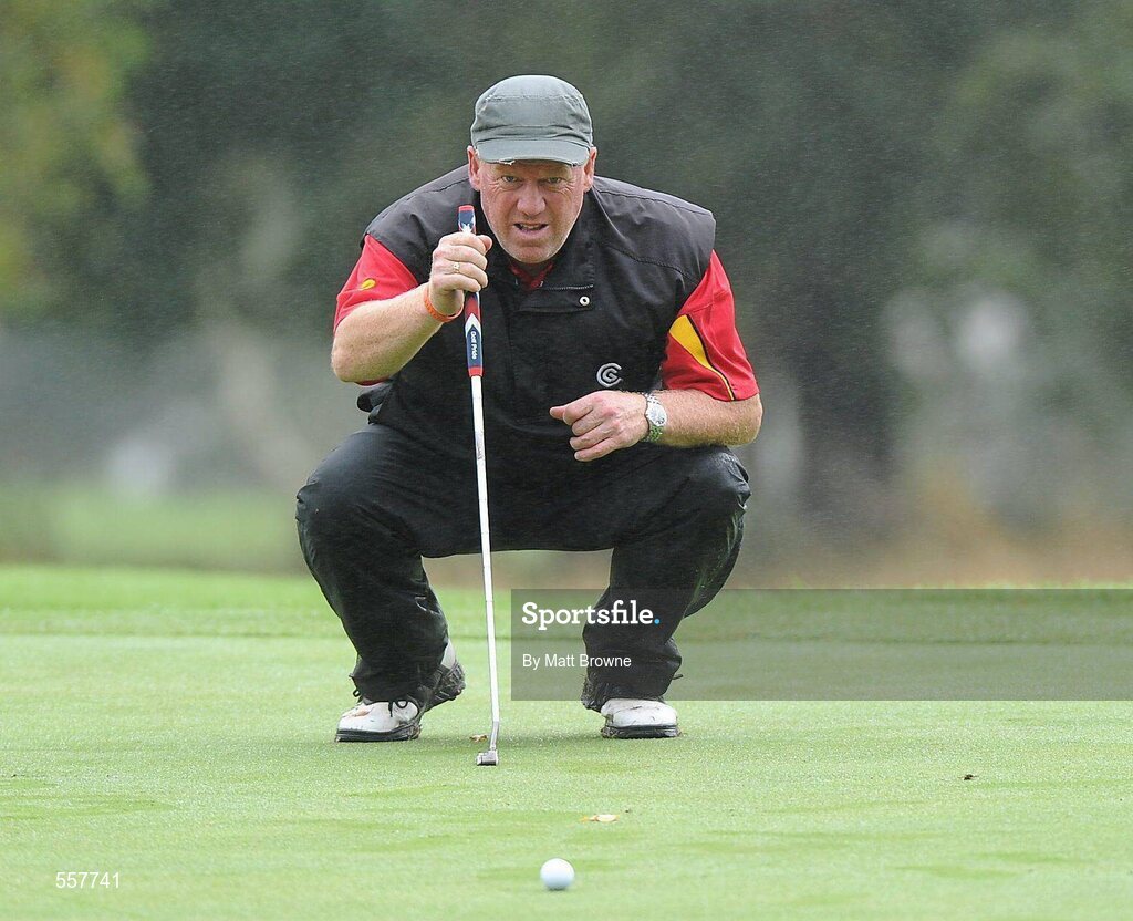 9 September 2011; Peter Murphy, from Loughrea GAA Club, lines up his putt on the 14th green during the 12th Annual All-Ireland GAA Golf Challenge 2011 Finals. Waterford Castle Golf and Country Club, Co. Waterford. Picture credit: Matt Browne / SPORTSFILE
