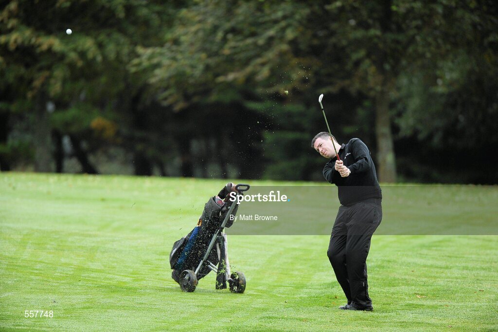 9 September 2011; John Fogarty, from the Irish Examiner, plays his second shot to the 18th green during the 12th Annual All-Ireland GAA Golf Challenge 2011 Finals. Waterford Castle Golf and Country Club, Co. Waterford. Picture credit: Matt Browne / SPORTSFILE