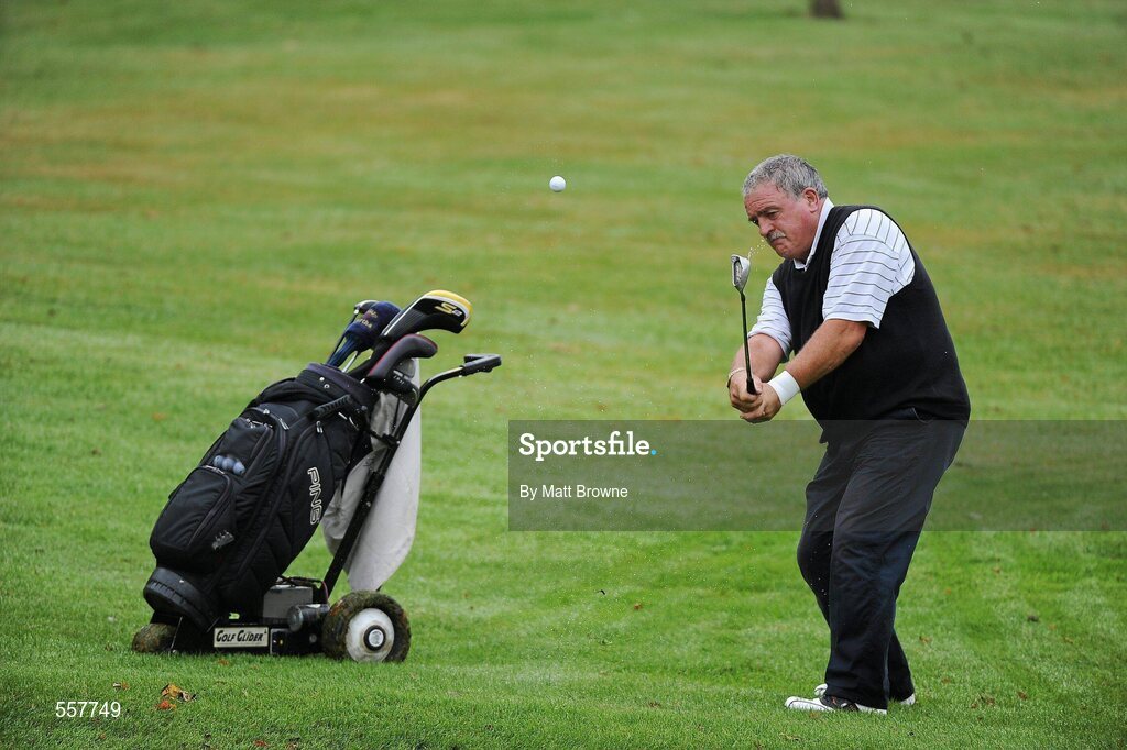 9 September 2011; Luke Power, from Castleblayney Faughs GAA Club, Co. Monaghan, pitches onto the 18th green during the 12th Annual All-Ireland GAA Golf Challenge 2011 Finals. Waterford Castle Golf and Country Club, Co. Waterford. Picture credit: Matt Browne / SPORTSFILE