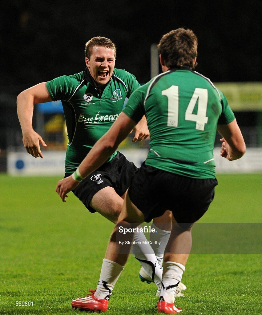 16 September 2011; Jack Carty, left, and Conor Finn, Connacht, celebrate their side's victory. Sword Security Under 20 Interprovincial, Leinster v Connacht, Donnybrook Stadium, Donnybrook, Dublin. Picture credit: Stephen McCarthy / SPORTSFILE