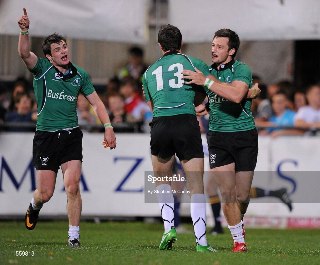 16 September 2011; Conor Finn, Connacht, right, celebrates with team-mates Robbie Henshaw, 13, and Shane Layden after scoring a late try. Sword Security Under 20 Interprovincial, Leinster v Connacht, Donnybrook Stadium, Donnybrook, Dublin. Picture credit: Stephen McCarthy / SPORTSFILE