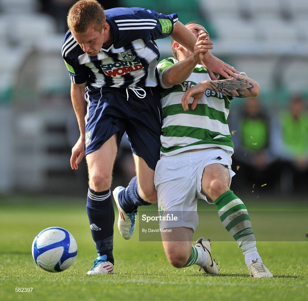 25 September 2011; Shane O'Connor, Bray Wanderers, tackles Gary McCabe , Shamrock Rovers resulting, in referee Richie Winter showing the red card to the Bray Wanderers player. Airtricity League Premier Division, Shamrock Rovers v Bray Wanderers, Tallaght Stadium, Tallaght, Dublin. Picture credit: David Maher / SPORTSFILE