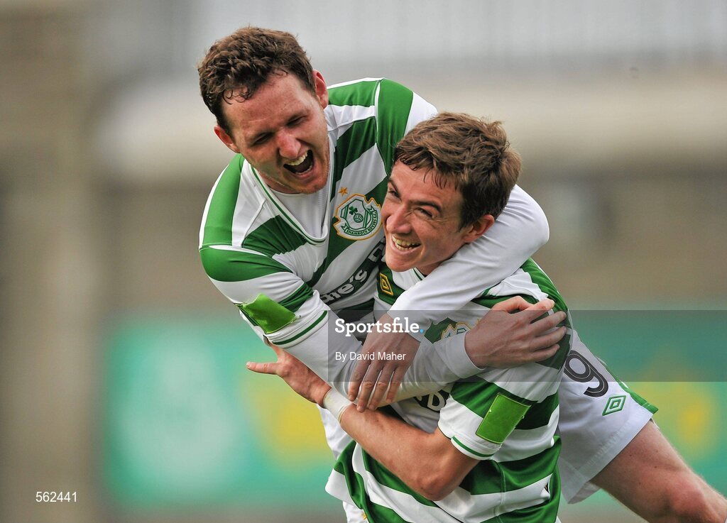 25 September 2011; Ronan Finn, right, Shamrock Rovers, celebrates after scoring his side's fourth goal with team-mate Gary Twigg. Airtricity League Premier Division, Shamrock Rovers v Bray Wanderers, Tallaght Stadium, Tallaght, Dublin. Picture credit: David Maher / SPORTSFILE