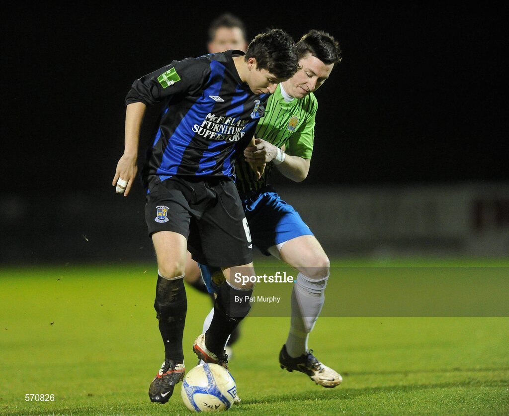 29 October 2011; Roy King, Athlone Town, in action against Declan O'Brien, Monaghan United. Airtricity League First Division, Athlone Town v Monaghan United, Lisseywollen, Athlone, Co. Westmeath. Picture credit: Pat Murphy / SPORTSFILE