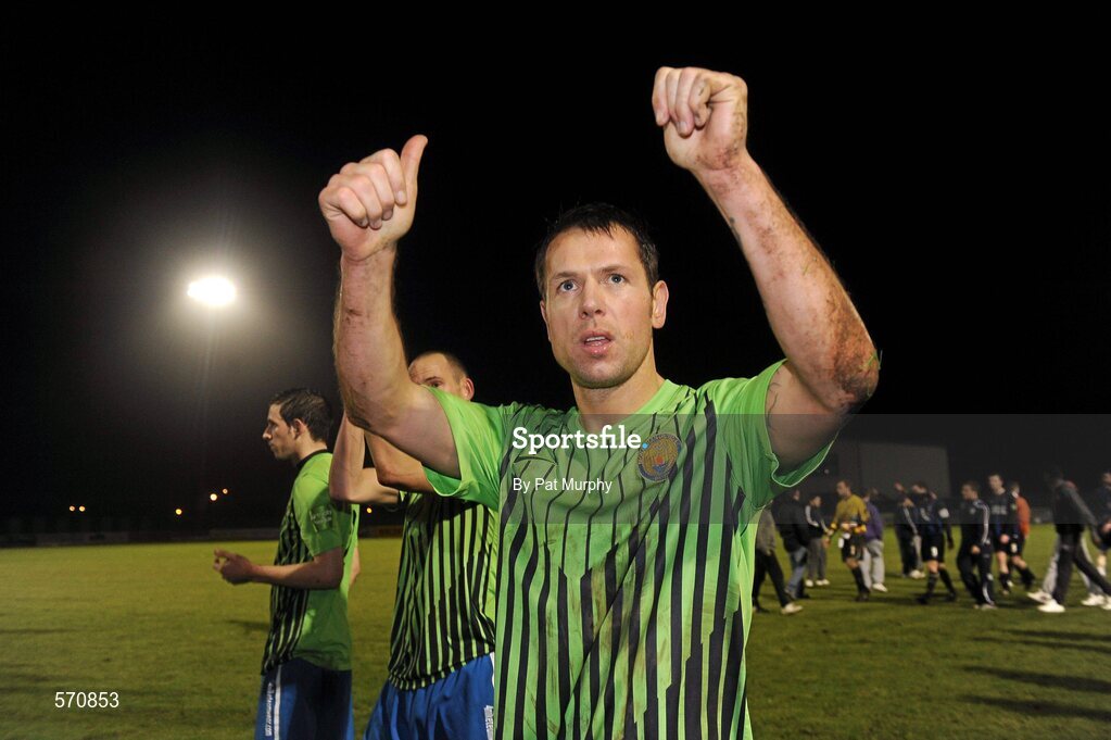 29 October 2011; Declan O'Brien, Monaghan United, salutes the crowd after the game. The game finished 5-0 to Monaghan United who qualify for the play-offs. Airtricity League First Division, Athlone Town v Monaghan United, Lisseywollen, Athlone, Co. Westmeath. Picture credit: Pat Murphy / SPORTSFILE