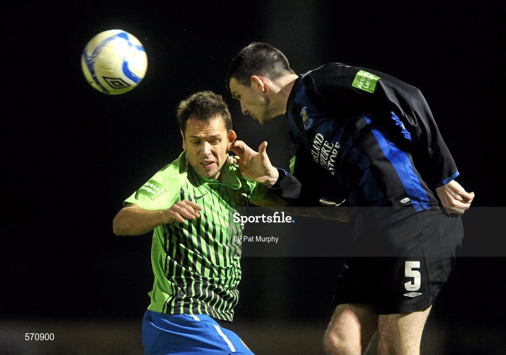 29 October 2011; Declan O'Brien, Monaghan United, in action against Paul Danaher, Athlone Town. Airtricity League First Division, Athlone Town v Monaghan United, Lisseywollen, Athlone, Co. Westmeath. Picture credit: Pat Murphy / SPORTSFILE