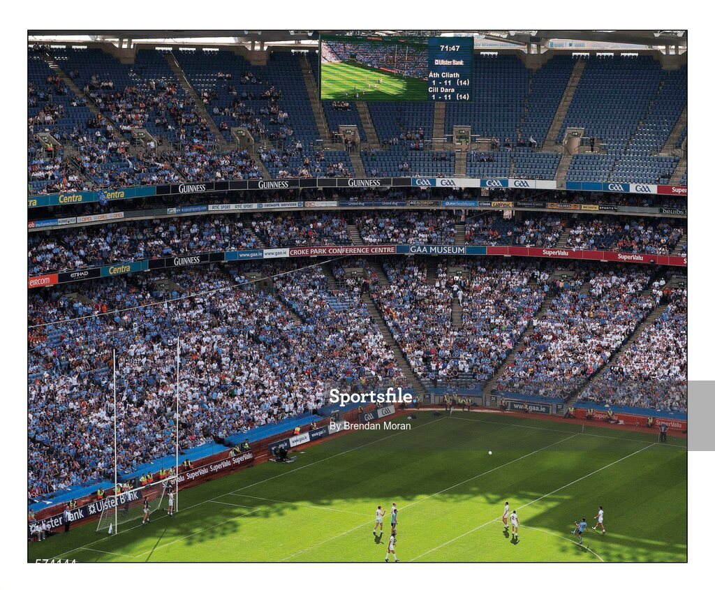 26 June 2011; Late frees and Dublin. Bernard Brogan caresses the ball over the Davin Stand crossbar to break Kildare's resistance and seal the deal in injury time. The ‘was he, wasn’t he fouled’ debate rages for some time after. Picture credit; Brendan Moran / SPORTSFILE