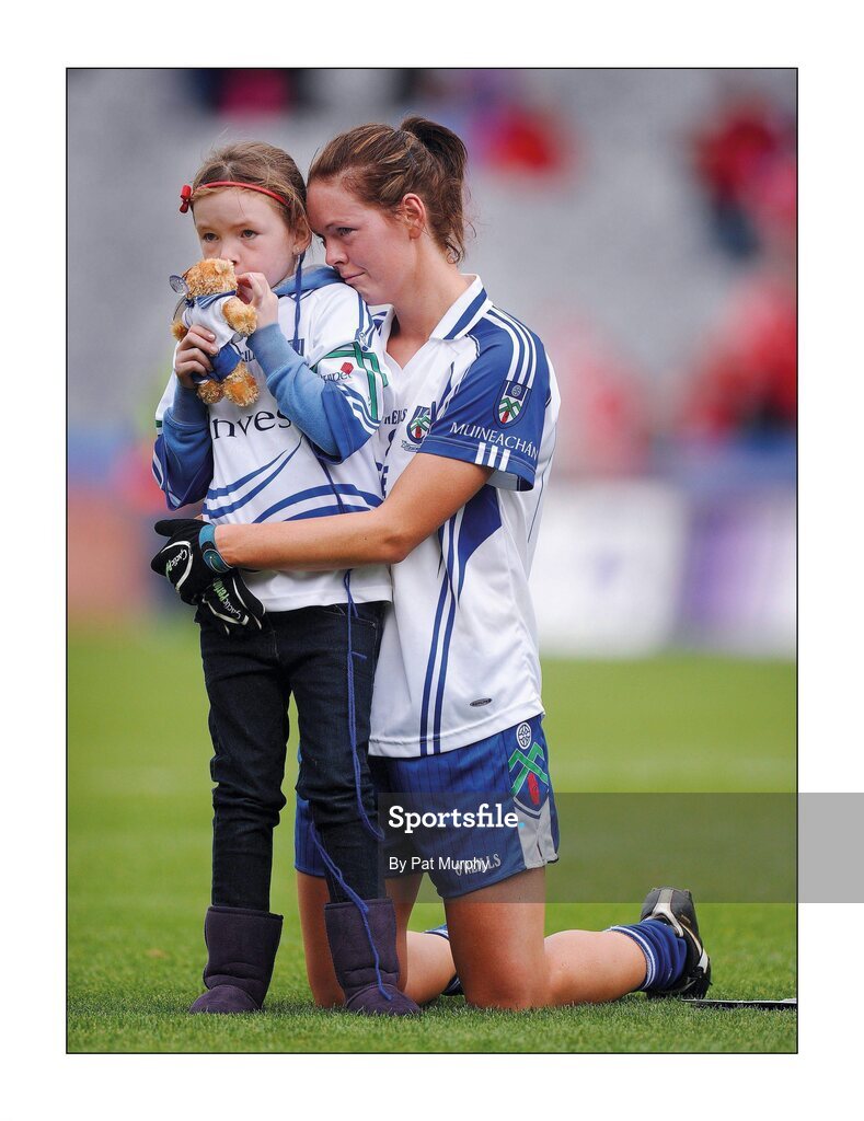 25 September 2011; The disappointment is best shared three ways. Monaghan’s Amanda Casey, her daughter Emma aged 7 and her toy mascot take in the final defeat to Cork. Picture credit; Pat Murphy / SPORTSFILE