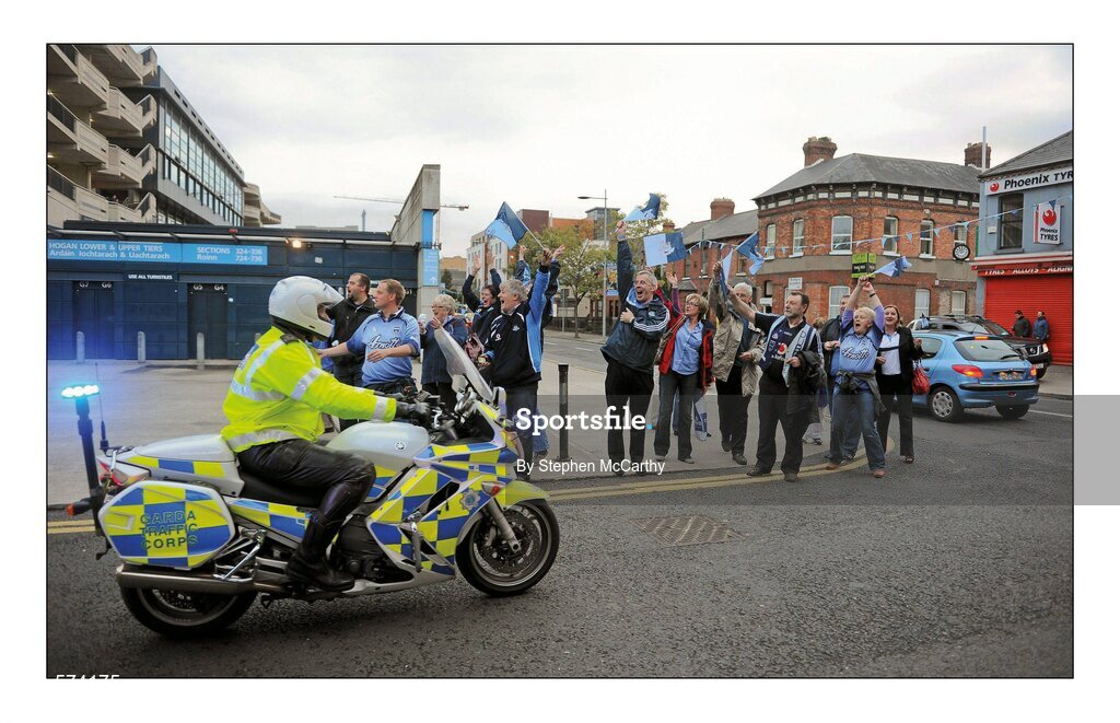 18 September 2011; Make way, special guest on the way. Members of the Blue Army, including All-Ireland medal winners Bernard Brogan Snr and his brother Jim, await the departure of Sam Maguire. The cup is bound for the Burlington Hotel but, crucially, this time it is not leaving the capital afterwards. Picture credit; Stephen McCarthy / SPORTSFILE