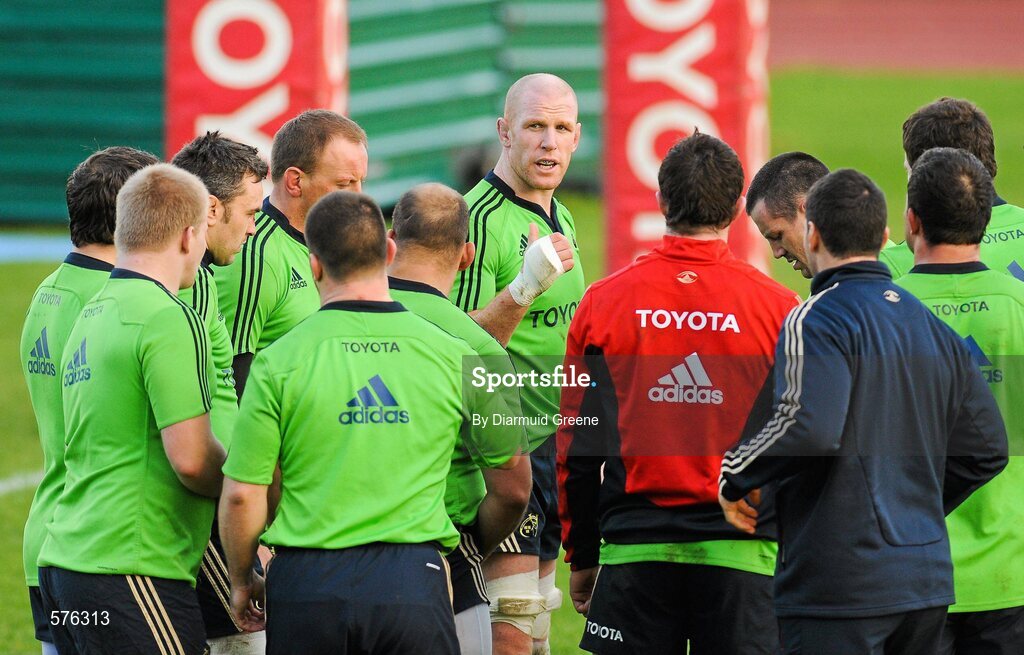 15 November 2011; Munster's Paul O'Connell speaks to his team-mates during squad training ahead of their Heineken Cup Pool 1 Round 2, match against Castres Olympique on Saturday November 19th. Munster Rugby Squad Training, University of Limerick, Limerick. Picture credit: Diarmuid Greene / SPORTSFILE