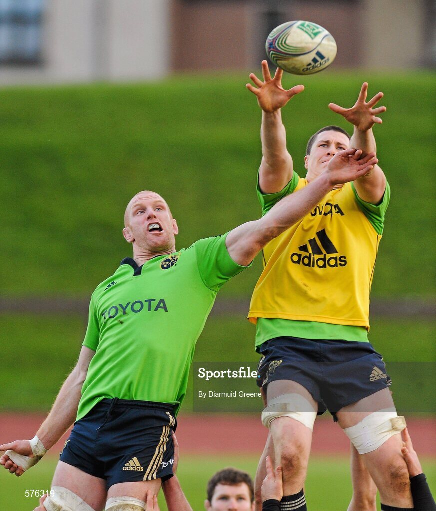 15 November 2011; Munster's Paul O'Connell contests a lineout with Ian Nagle during squad training ahead of their Heineken Cup Pool 1 Round 2, match against Castres Olympique on Saturday November 19th. Munster Rugby Squad Training, University of Limerick, Limerick. Picture credit: Diarmuid Greene / SPORTSFILE