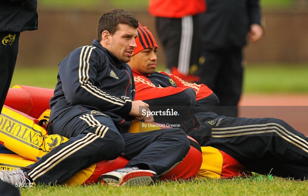 15 November 2011; Munster's Denis Leamy, left, and Lifeimi Mafi watch on during squad training ahead of their Heineken Cup Pool 1 Round 2, match against Castres Olympique on Saturday November 19th. Munster Rugby Squad Training, University of Limerick, Limerick. Picture credit: Diarmuid Greene / SPORTSFILE