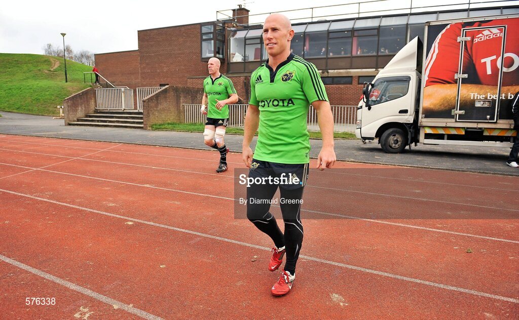 15 November 2011; Munster's Peter Stringer and Paul O'Connell make their way out for squad training ahead of their Heineken Cup Pool 1 Round 2, match against Castres Olympique on Saturday November 19th. Munster Rugby Squad Training, University of Limerick, Limerick. Picture credit: Diarmuid Greene / SPORTSFILE