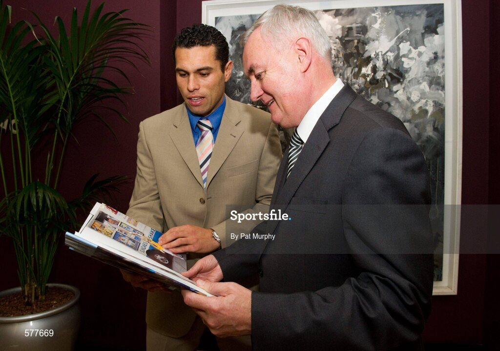 21 November 2011; Uachtarán CLG Criostóir Ó Cuana with Cork hurler and Ulster Bank's Sean Og O'hAilpin at the launch of 'A Season of Sunday's 2011' sponsored by Ulster Bank. Launch of 'A Season of Sundays 2011', The Croke Park Hotel, Jones' Road, Dublin. Picture credit: Pat Murphy / SPORTSFILE